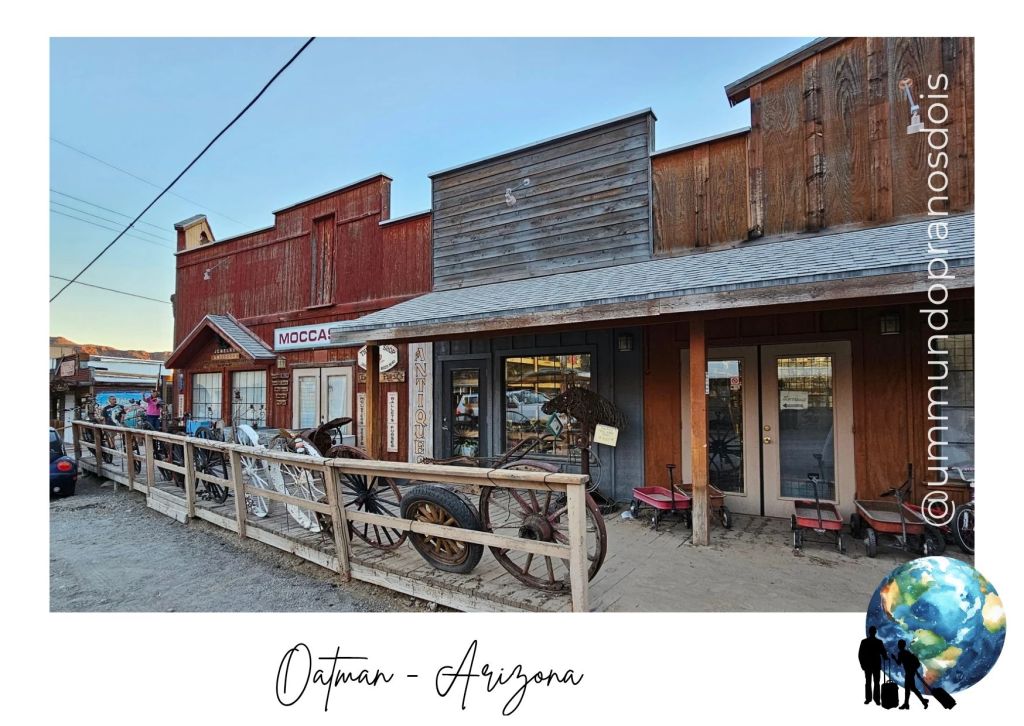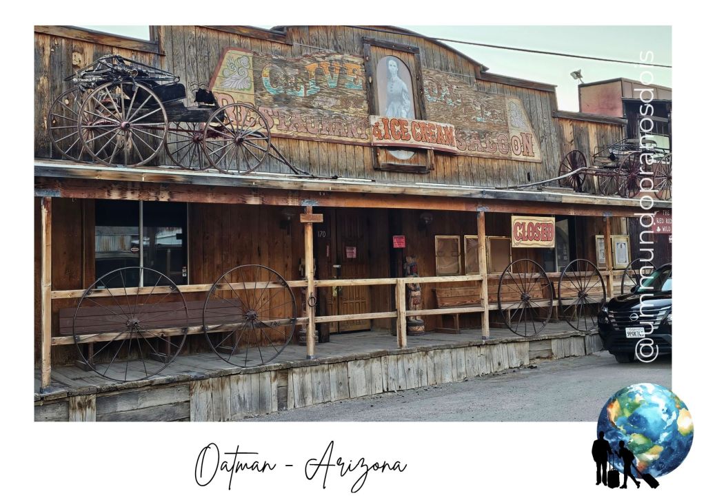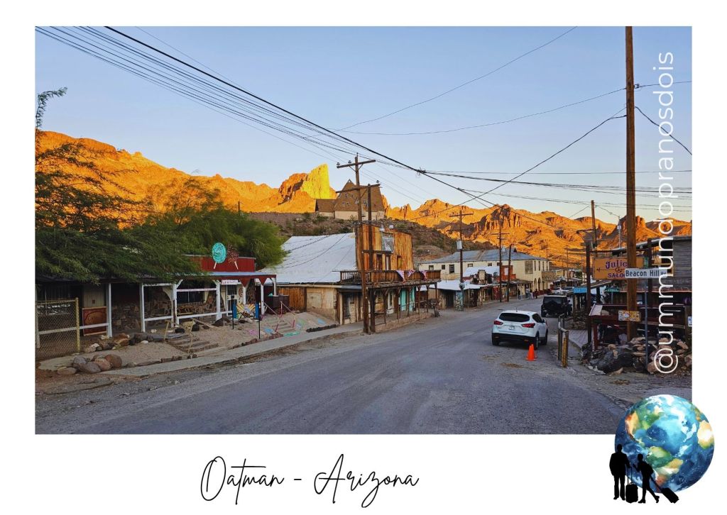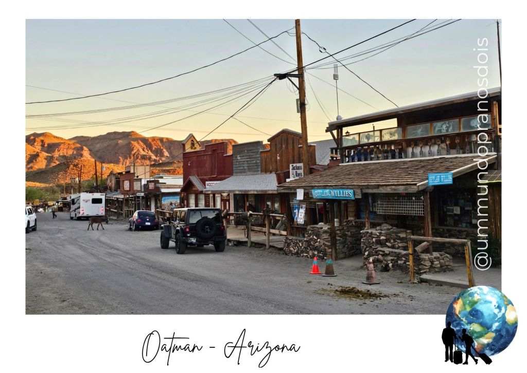 Depois de algumas paradas no meio da estrada para admirar a paisagem árida do deserto do Arizona, chegamos a Oatman, que nasceu no início do século XX, impulsionada pela febre do ouro. Era um centro de mineração próspero até os anos 40, quando as operações de mineração foram encerradas por decreto federal, pois o ouro foi considerado não essencial para o esforço de guerra. Sem a mineração, a maioria dos moradores foi embora, e Oatman se tornou uma cidade quase abandonada, justificando o apelido de “cidade fantasma”.