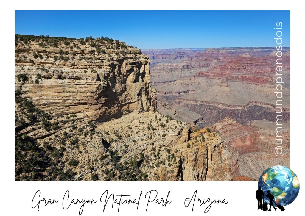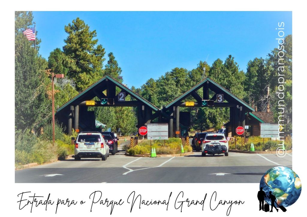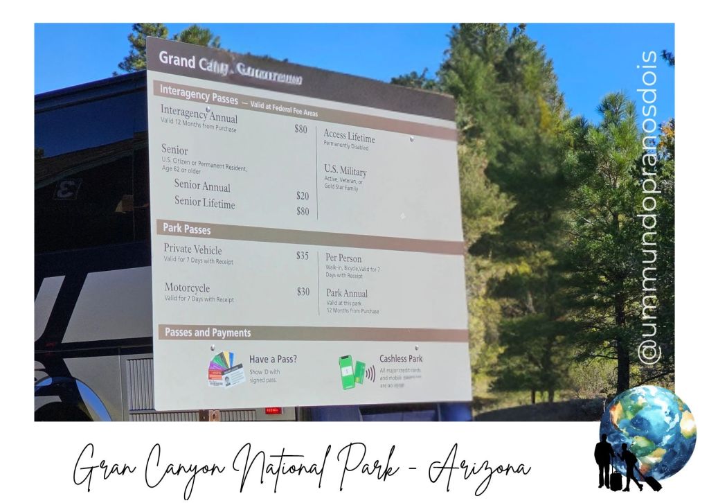 Percorremos pouco menos 90 km até chegar na entrada sul do Grand Canyon National Park. A entrada custa 35 dólares (por veículo), mas hoje não houve cobrança por conta do shutdown do governo americano. Entramos então no 0800, felizes da vida por ter economizado uns dolinhos!!! E super curiosos com o que veríamos por lá.