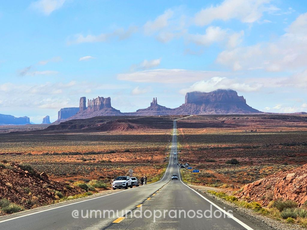 Seguimos para a próxima atração que também faz parte dos parques das tribos Navajo: o Monument Valley. No caminho, uma paradinha pra fotografar o ponto onde foram gravadas cenas do filme Forrest Gump, com as “esculturas” do Monument Valley ao fundo. É bem bonito, pena que o dia tava meio fechadão… abria e fechava toda hora.