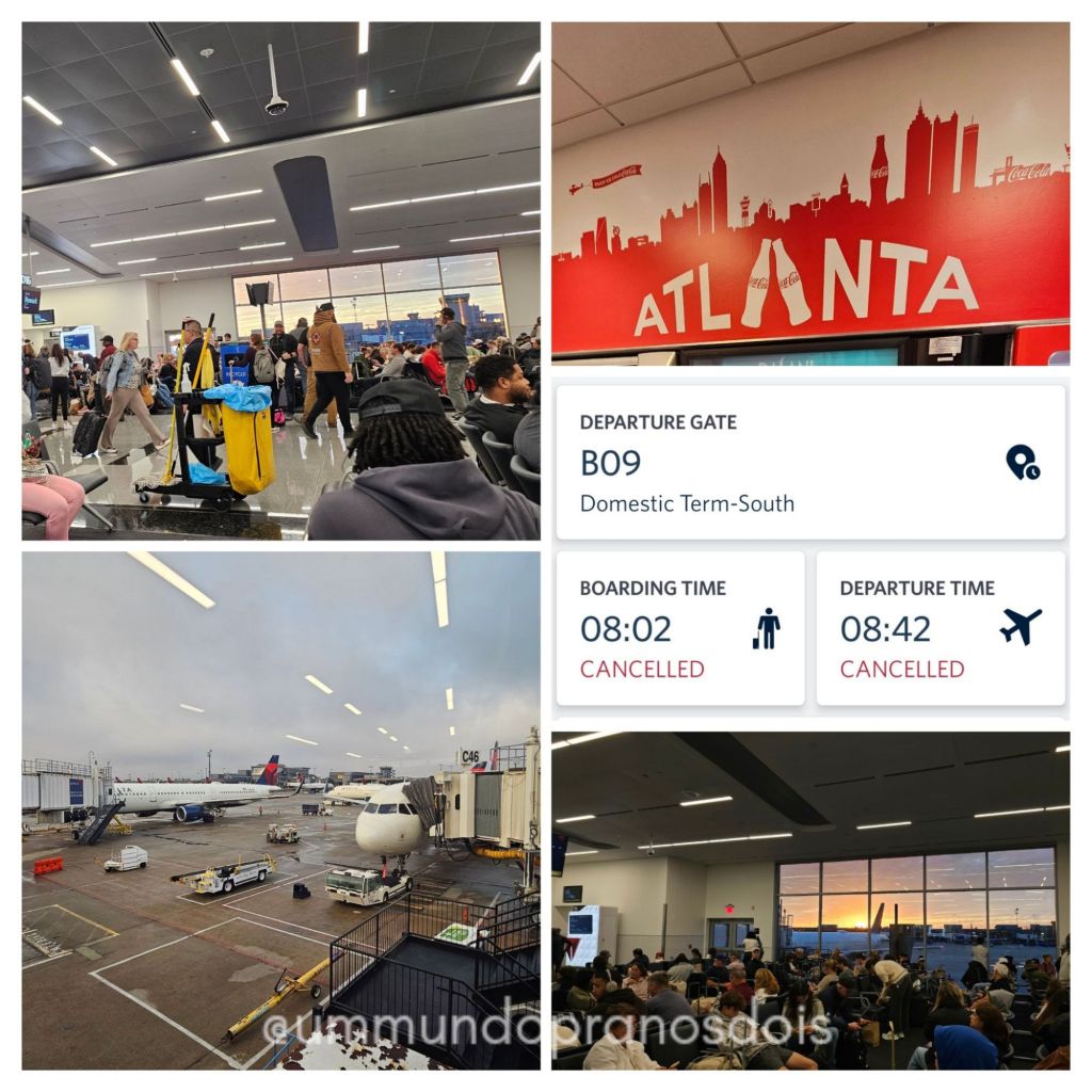 Os problemas começaram logo em seguida. Lembram do shutdown do governo americano? Pois é, ele voltou a nos assombrar. Nosso voo foi cancelado. Nos colocaram numa fila de espera para o próximo, que seria as 10h.