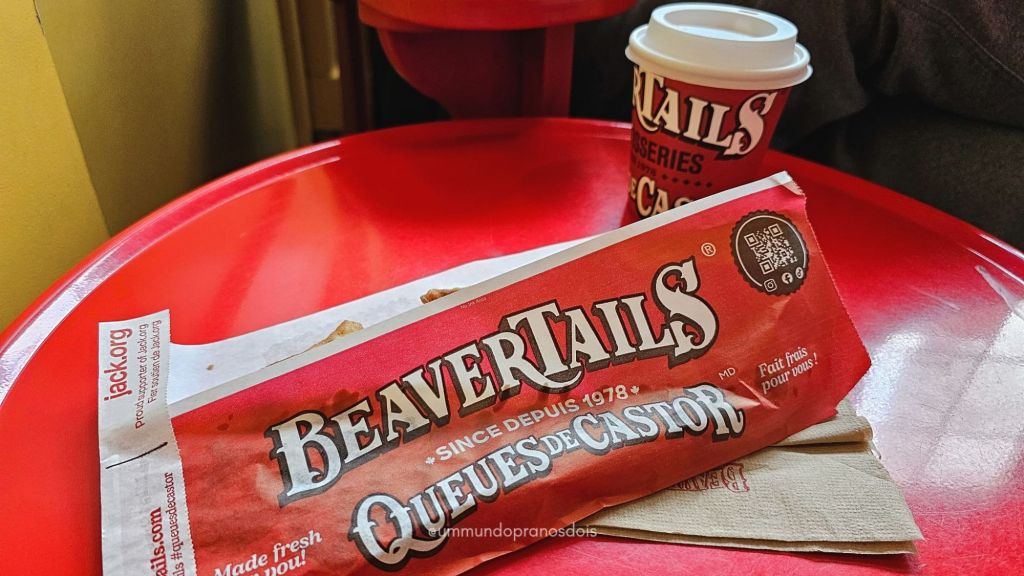 Imersão cultural também inclui gastronomia local, então rolou o famoso poutine, o rabo de castor (mas nenhum castor foi machucado no processo), o chocolate quente e até feirinha de Natal. Muito gostoso! Amo cultura! Kkkkkkk
