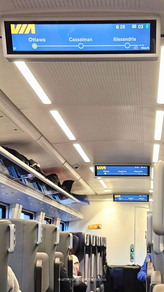 O trem aqui não é rápido, nem barato e pelo jeito, nem pontual. Com certa antecedência já tínhamos recebido um aviso da companhia dizendo que hoje uma parte da estrada está em manutenção e isso vai atrasar o trem. Além disso tem previsão de neve ou chuva congelada, o que pode atrasar ainda mais… E pra fechar com chave de ouro, temos uma escala em Ottawa, que de uma hora passou para 2 minutos e agora já está com previsibilidade de perdida. Oh god! Essa viagem tá só no 7×1!!!