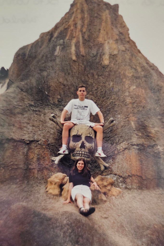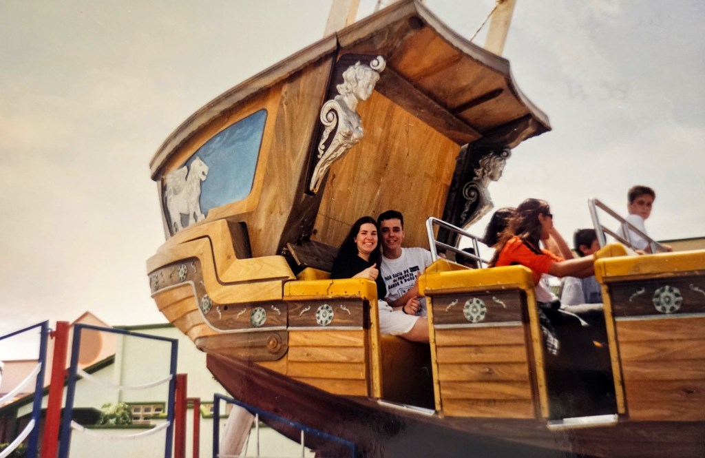 Acho que a nossa estreia como viajantes foi a excursão da minha formatura do ensino médio (que na época a gente chamava de 2º grau), naquele mesmo ano – 1996. Minha irmã também foi junto. E outros colegas da turma e alguns professores da escola. Foi um final de semana divertido no estado vizinho, Santa Catarina. Lembro que descemos até Balneário Camboriú, bem antes do glamour atual… O dia não estava bonito, ainda assim, demos uma passeada na praia e no finzinho da tarde hotelzinho bem simplório. A noite, passamos em uma festa típica na cidade de Itajaí, a Marejada, uma festa de pescados, meio nada a ver… No dia seguinte, o tão sonhado Beto Carrero World! E então retornamos para Curitiba. Olha a maravilha de fotos que eu achei!!! Tão jovens….